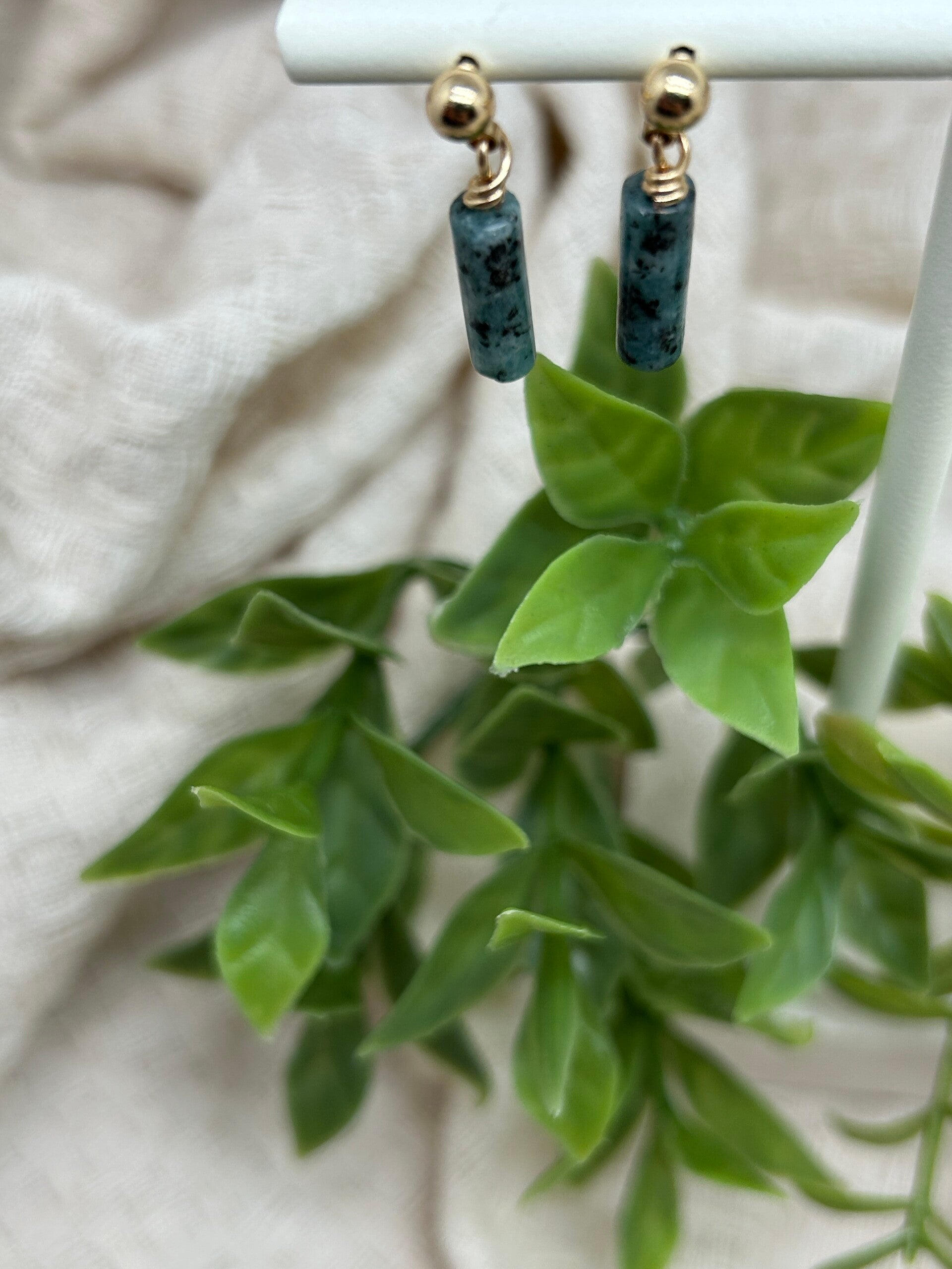 Deze goudkleurige oorstekers zijn gemaakt van chirurgisch roestvrij staal met een 18K goudlaag. De hanger is turquoise graniet. Er wordt gezegd dat dit gesteente een aardende werking heeft.