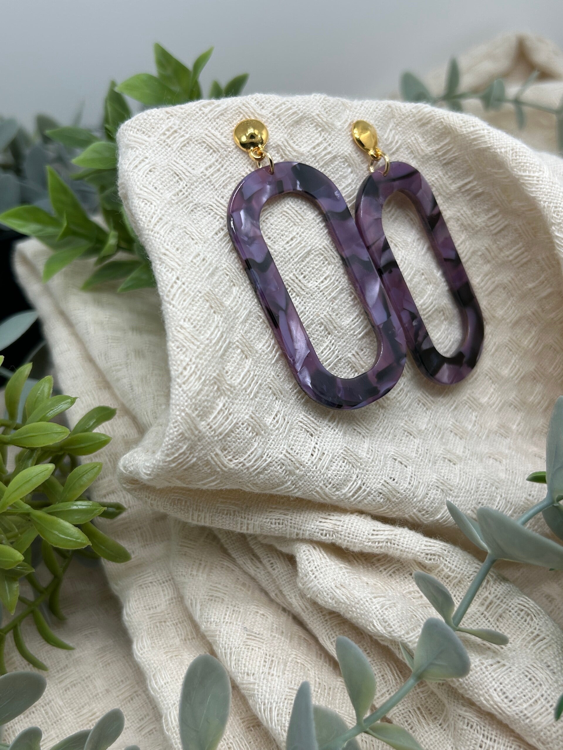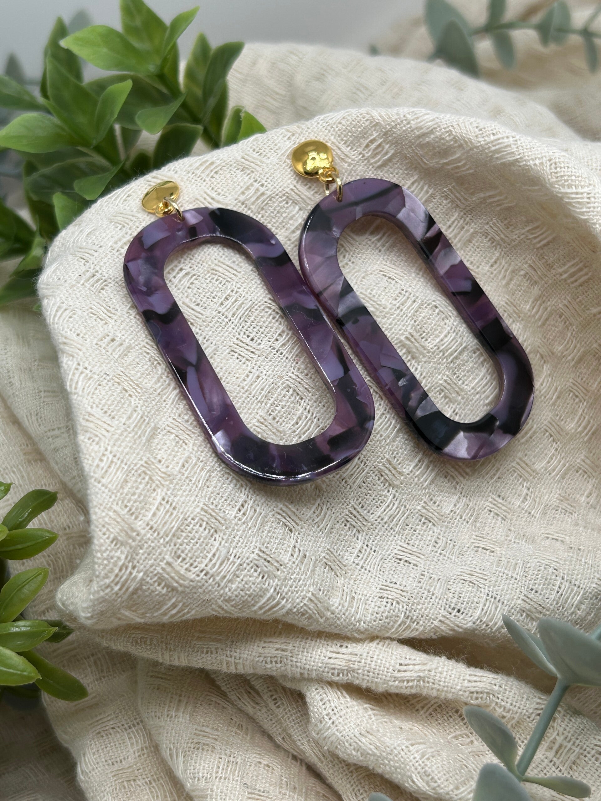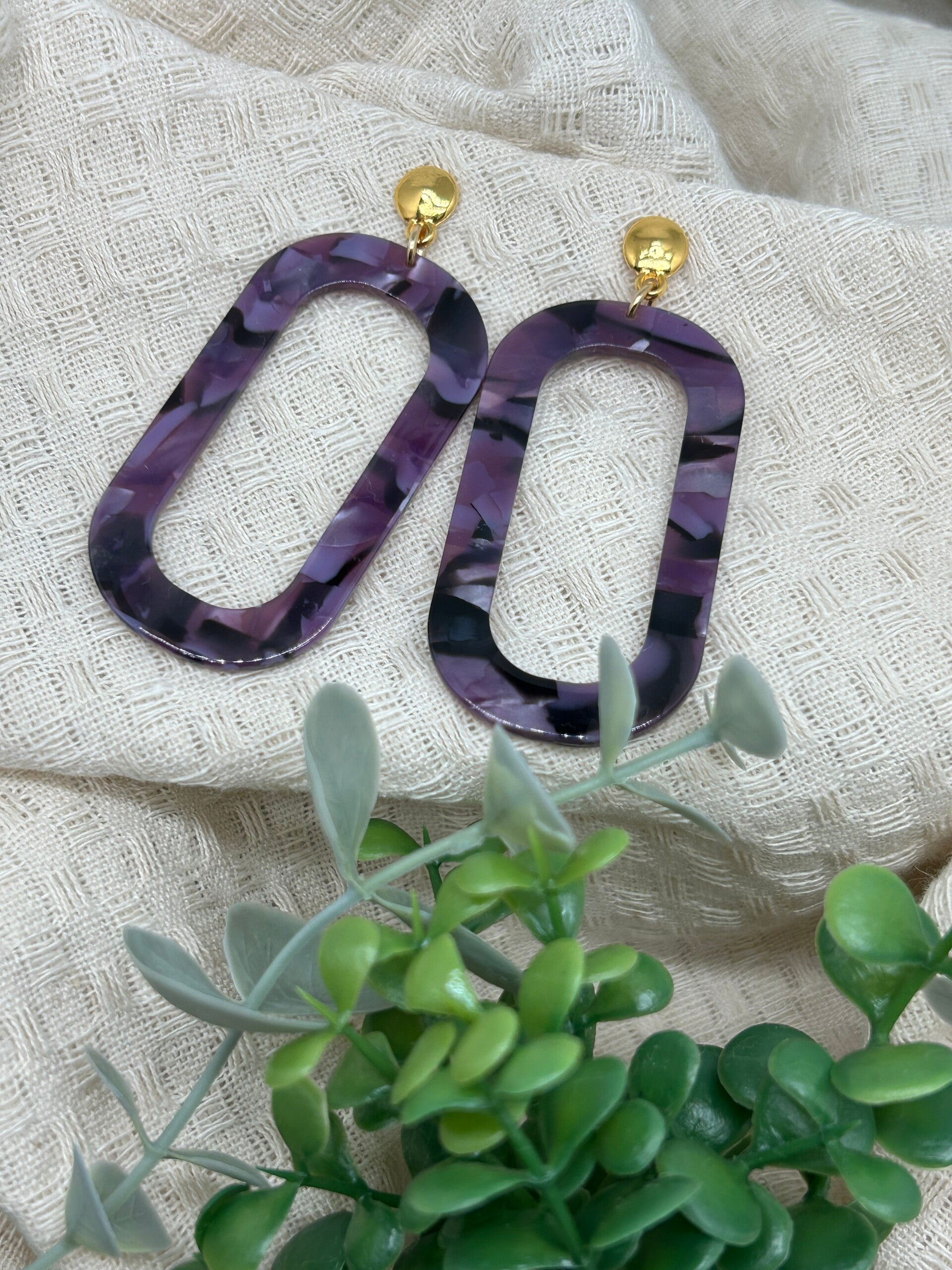 Deze goudkleurige oorbellen zijn gemaakt van DQ-metaal met een hanger in paarse tinten.