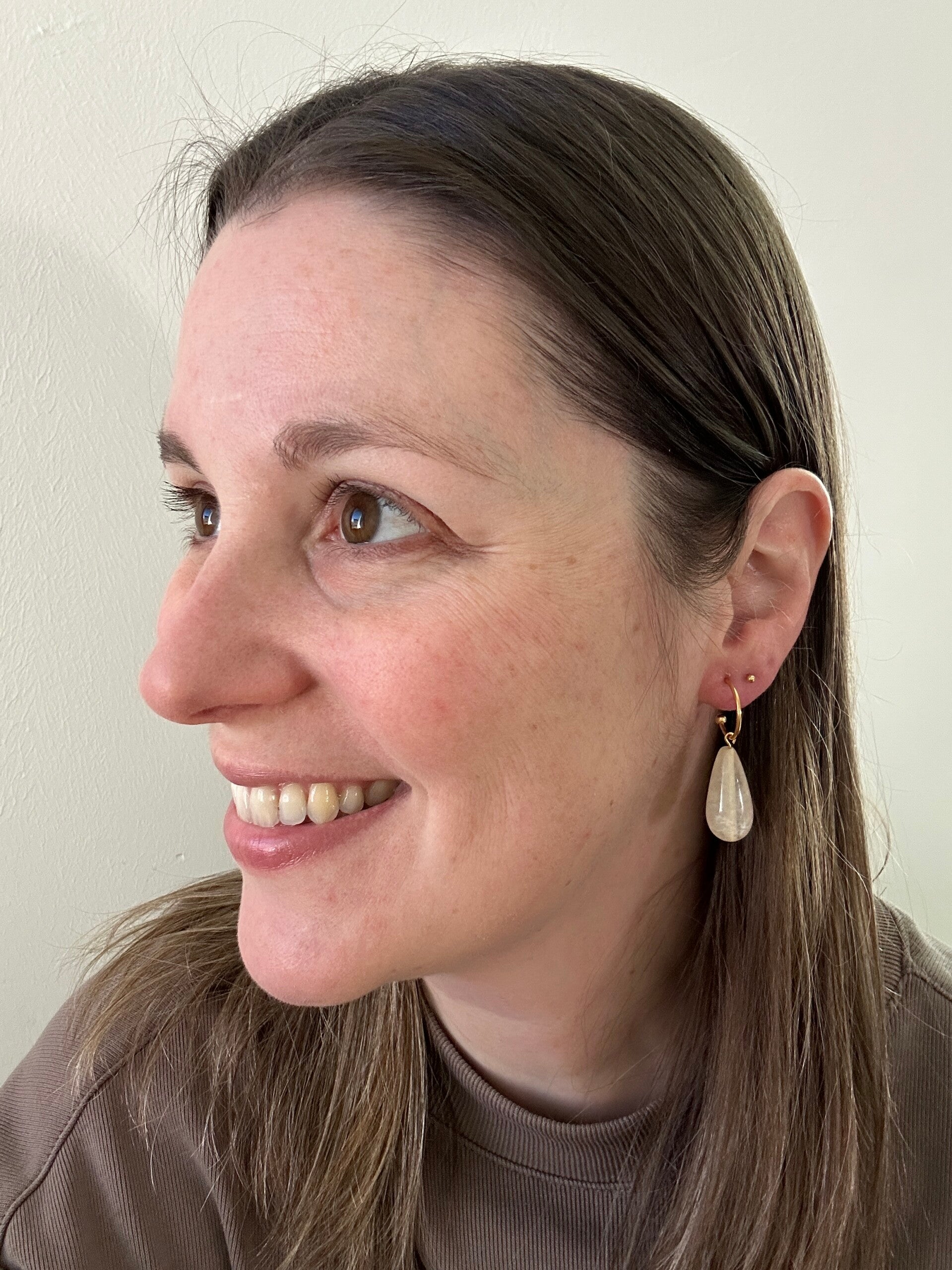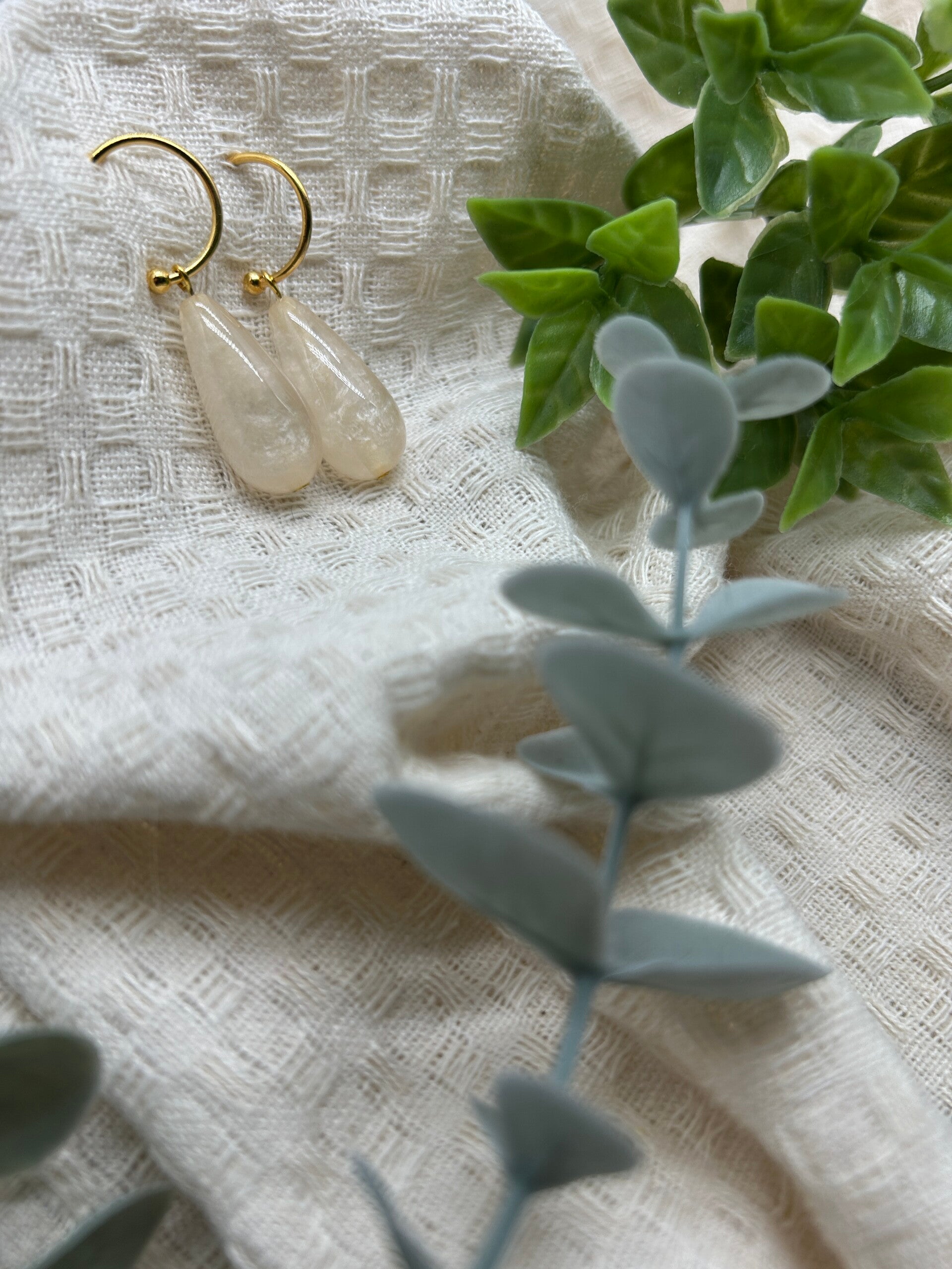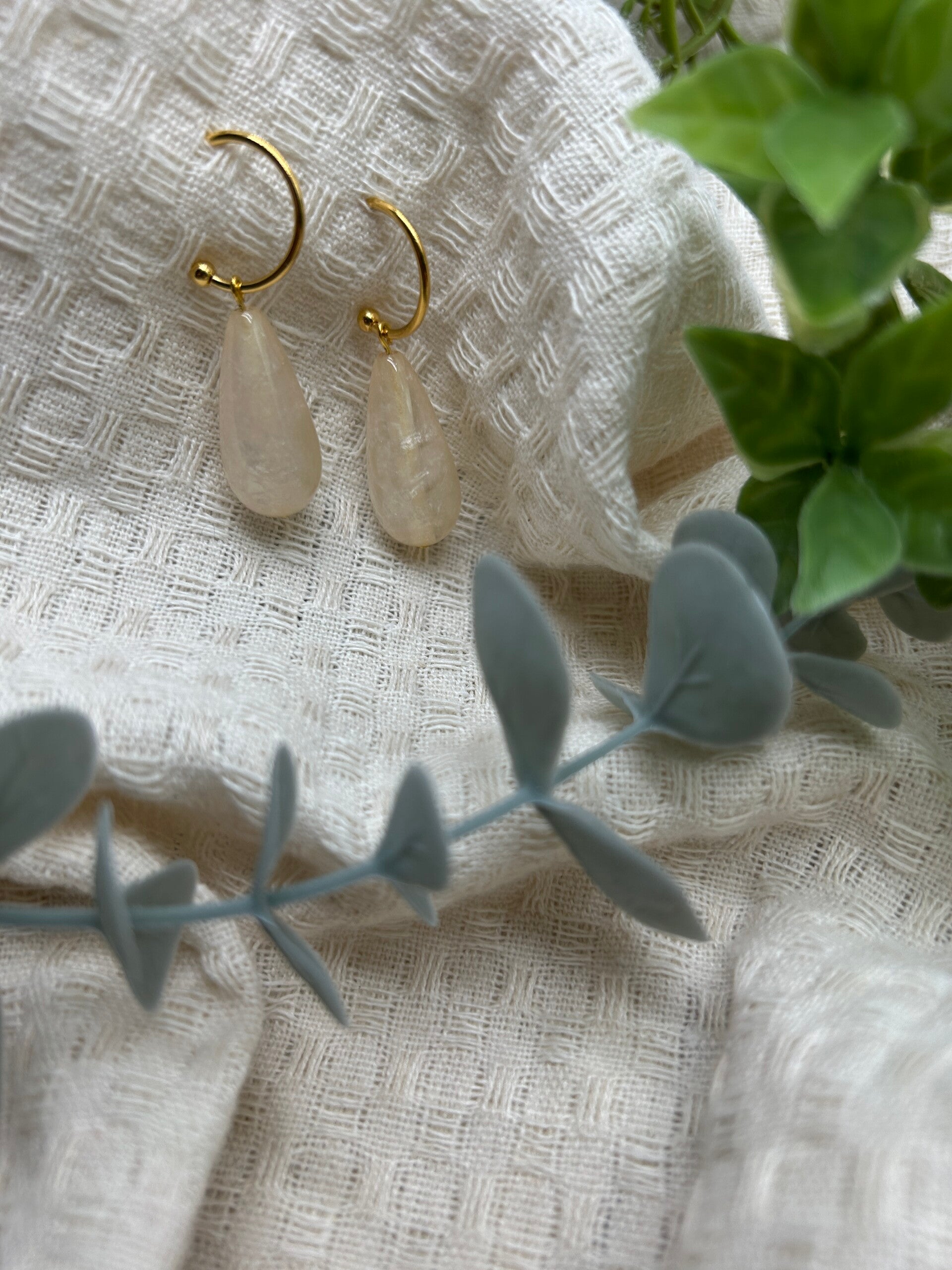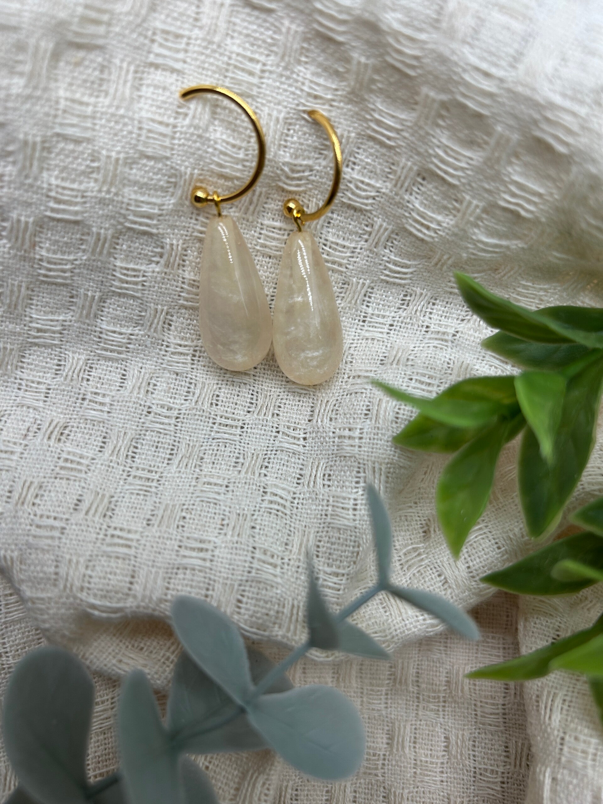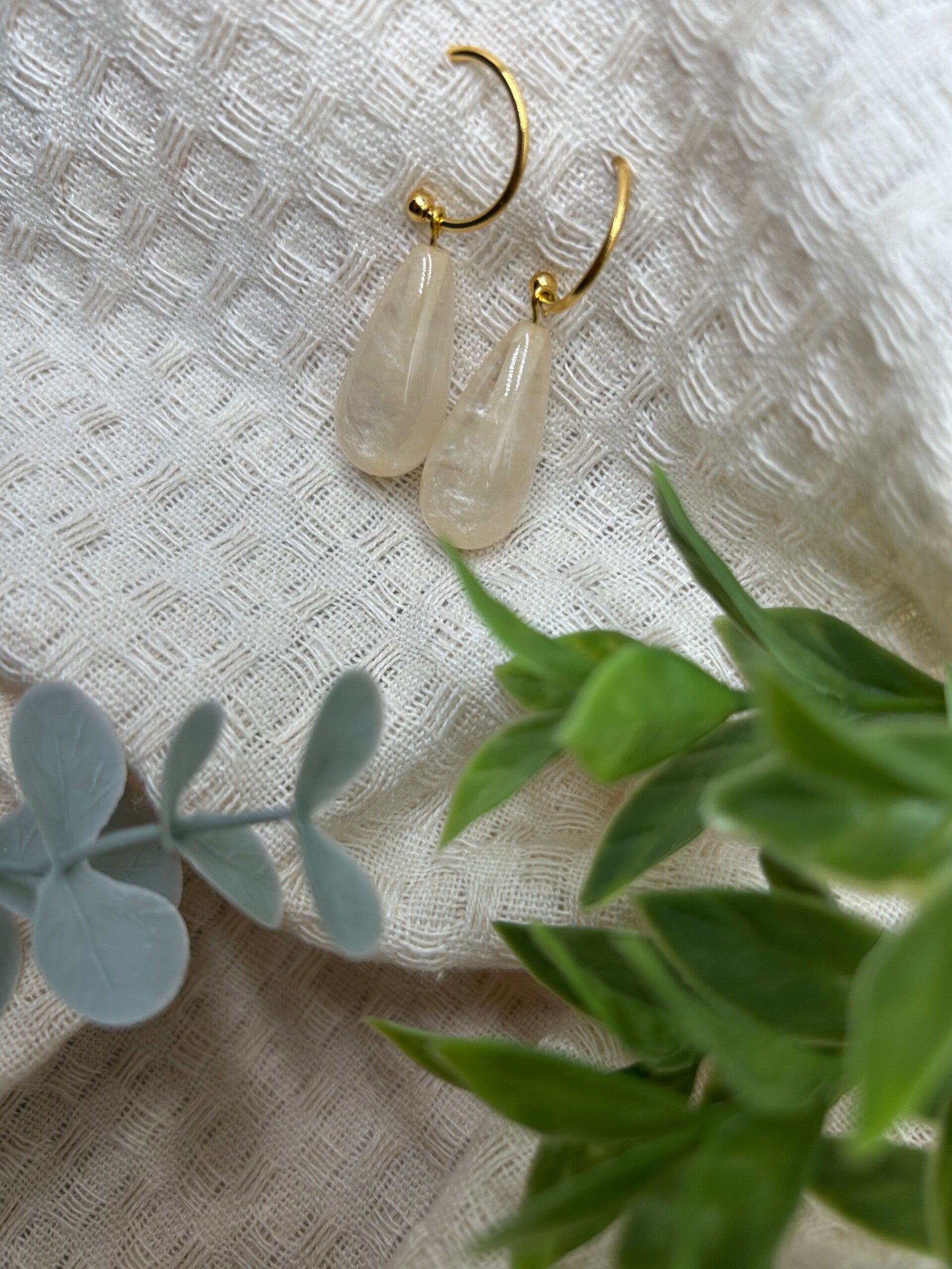 Deze goudkleurige oorbellen zijn gemaakt van DQ-metaal met een hanger in druppelvorm in parelmoer wit.