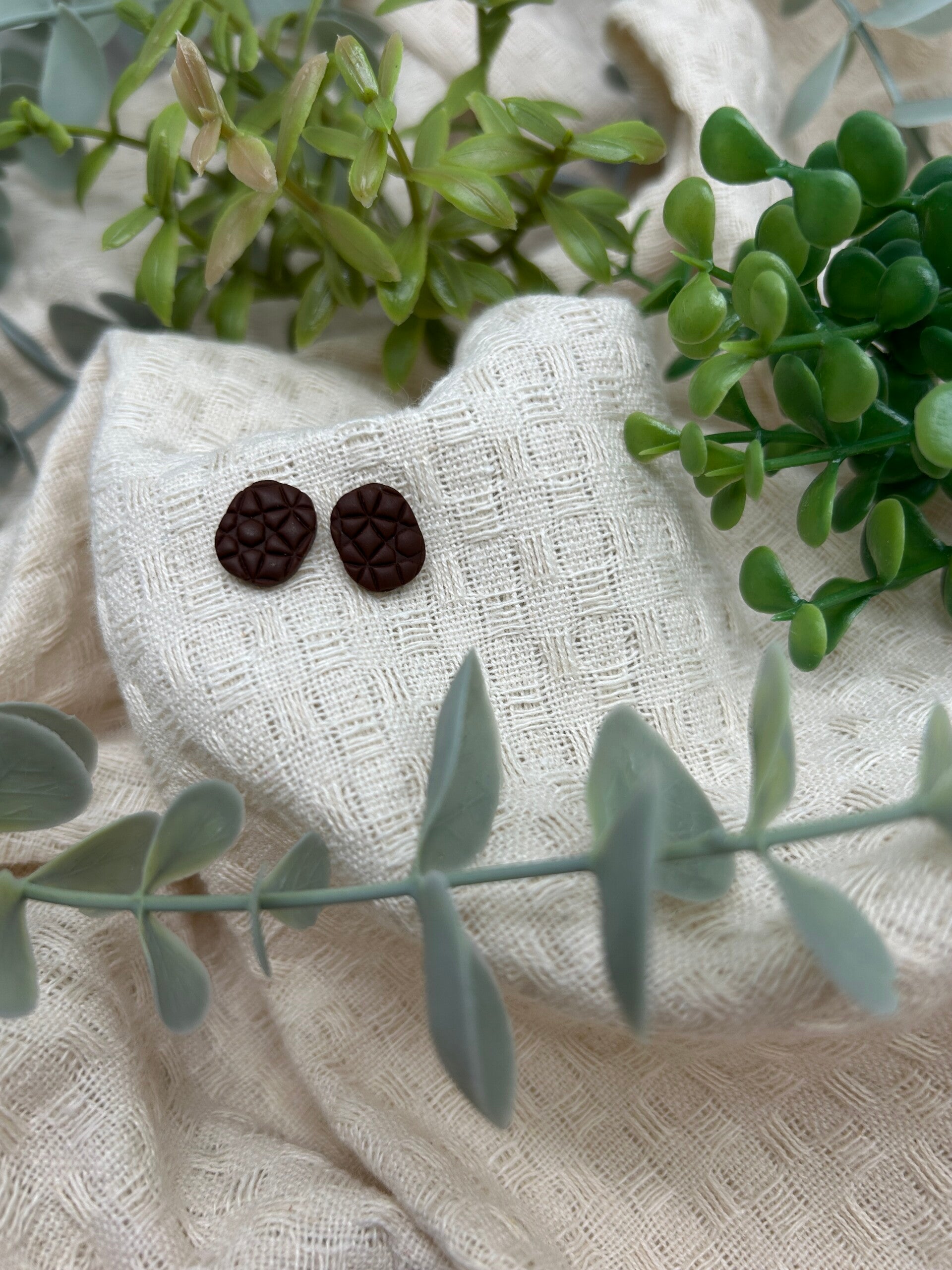 Deze oorbellen uit bruine klei hebben een ledermotief. Ze zijn ideaal als leuke basic.