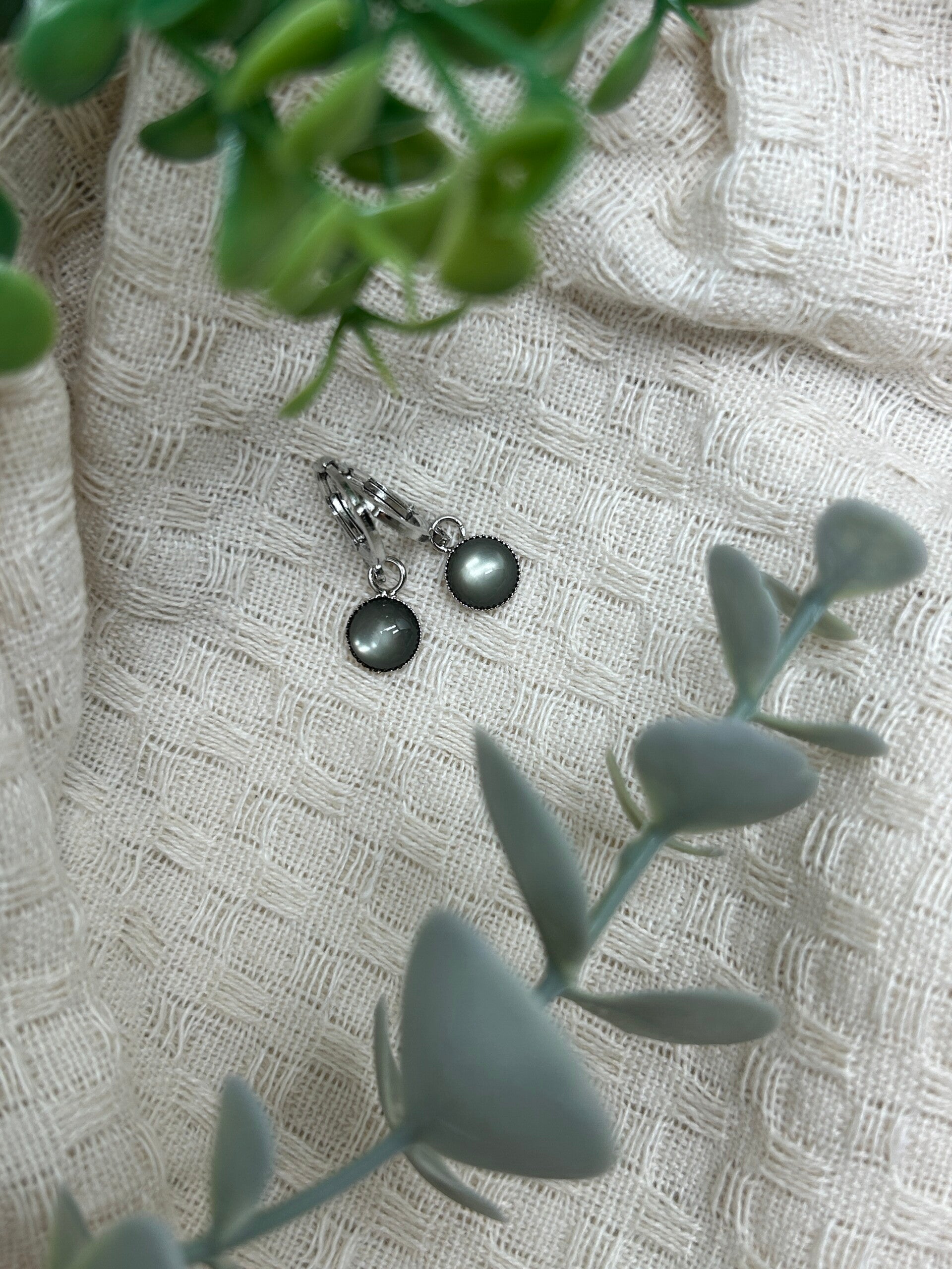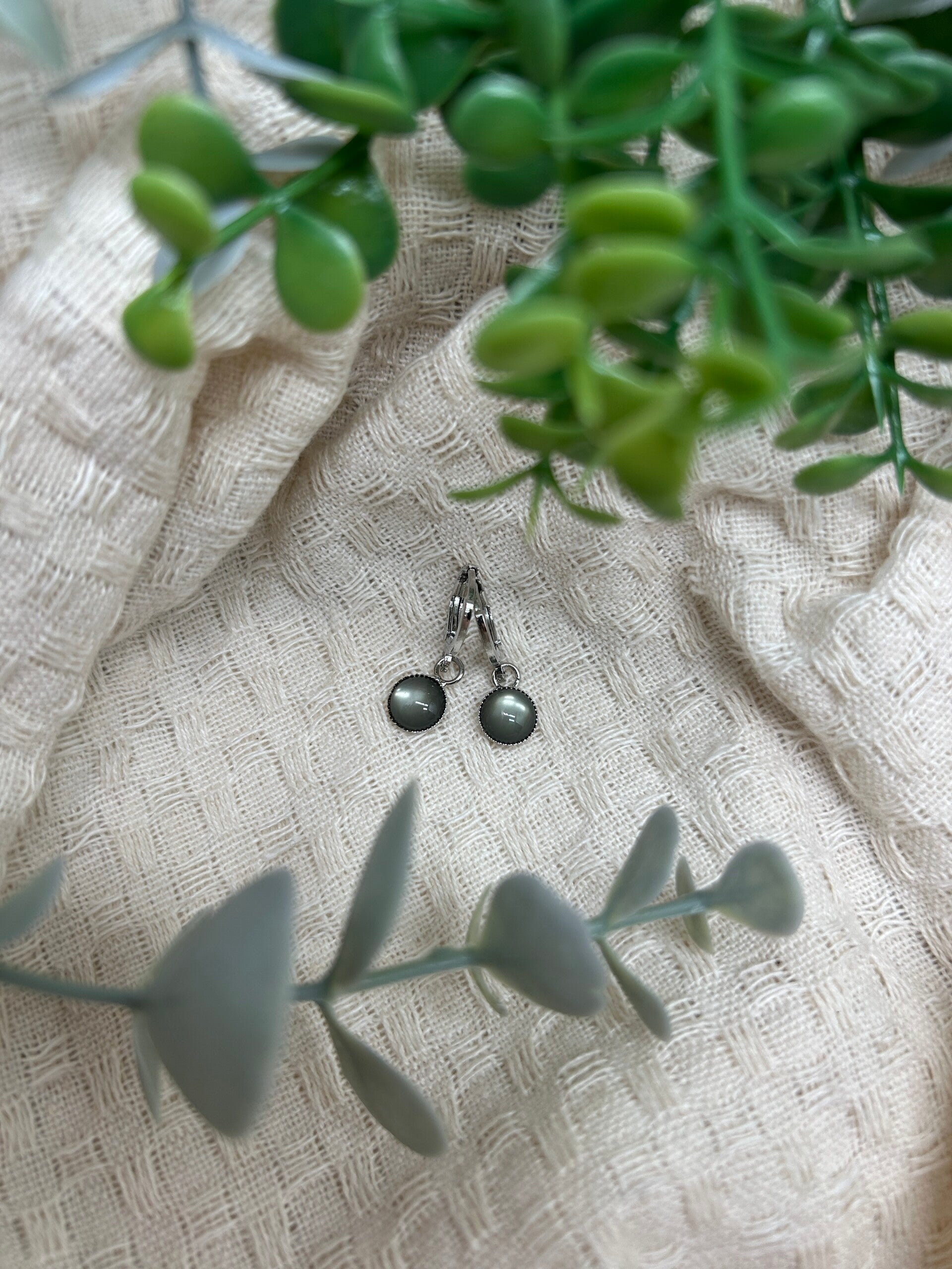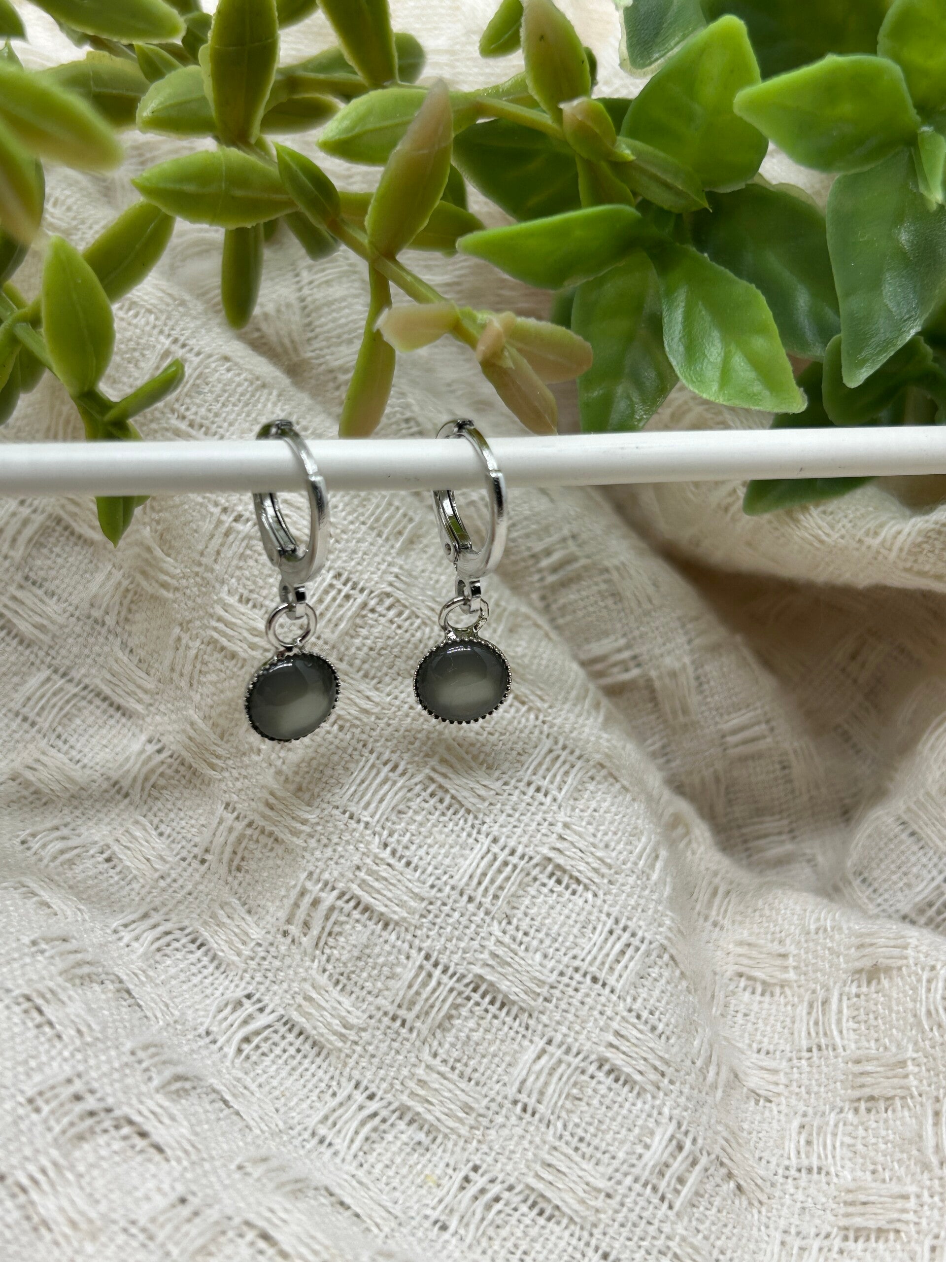Een zilverkleurig oorbelletje in DQ-metaal met een groen-grijs hangertje. Ook geschikt voor kinderoortjes.