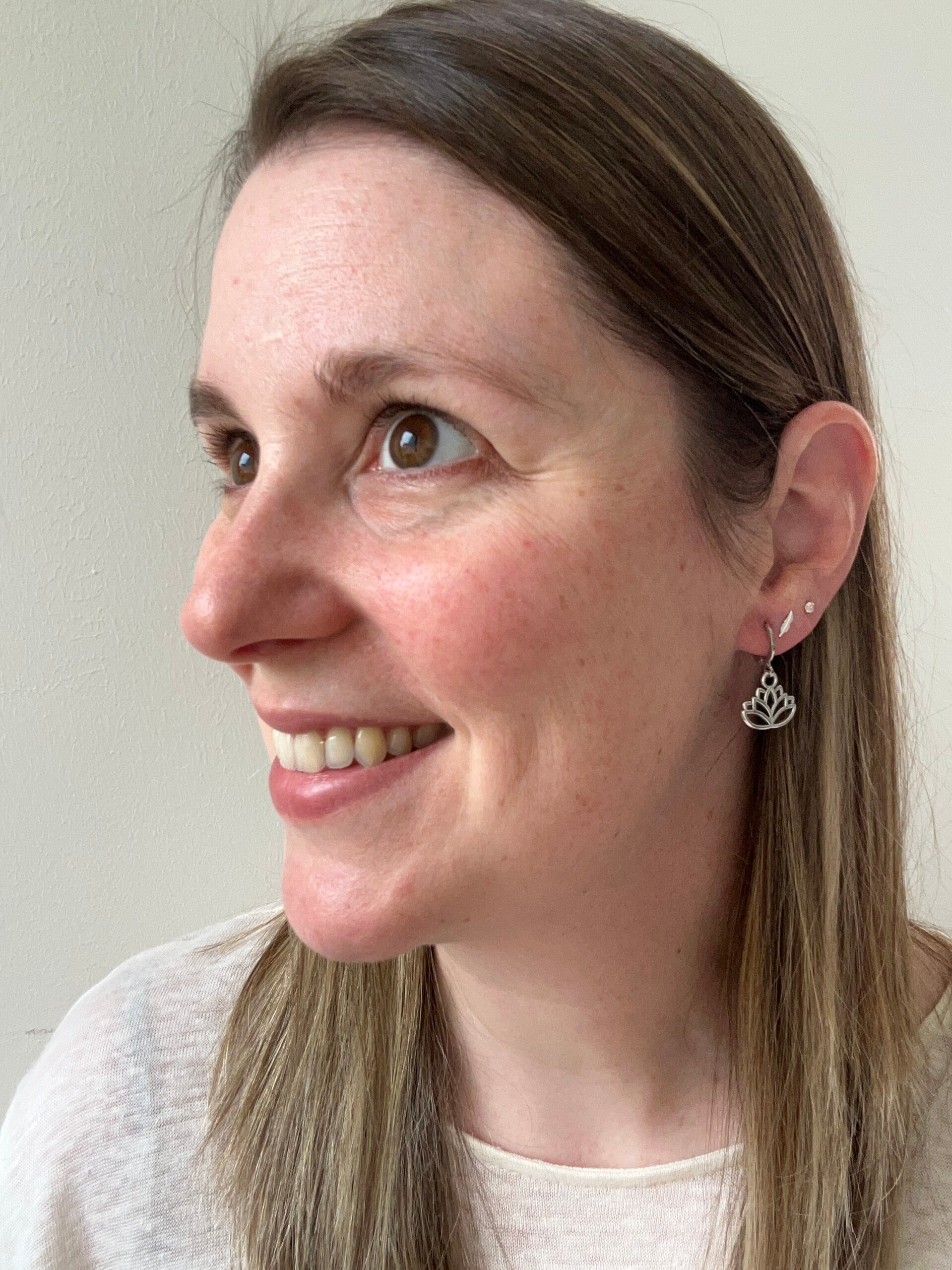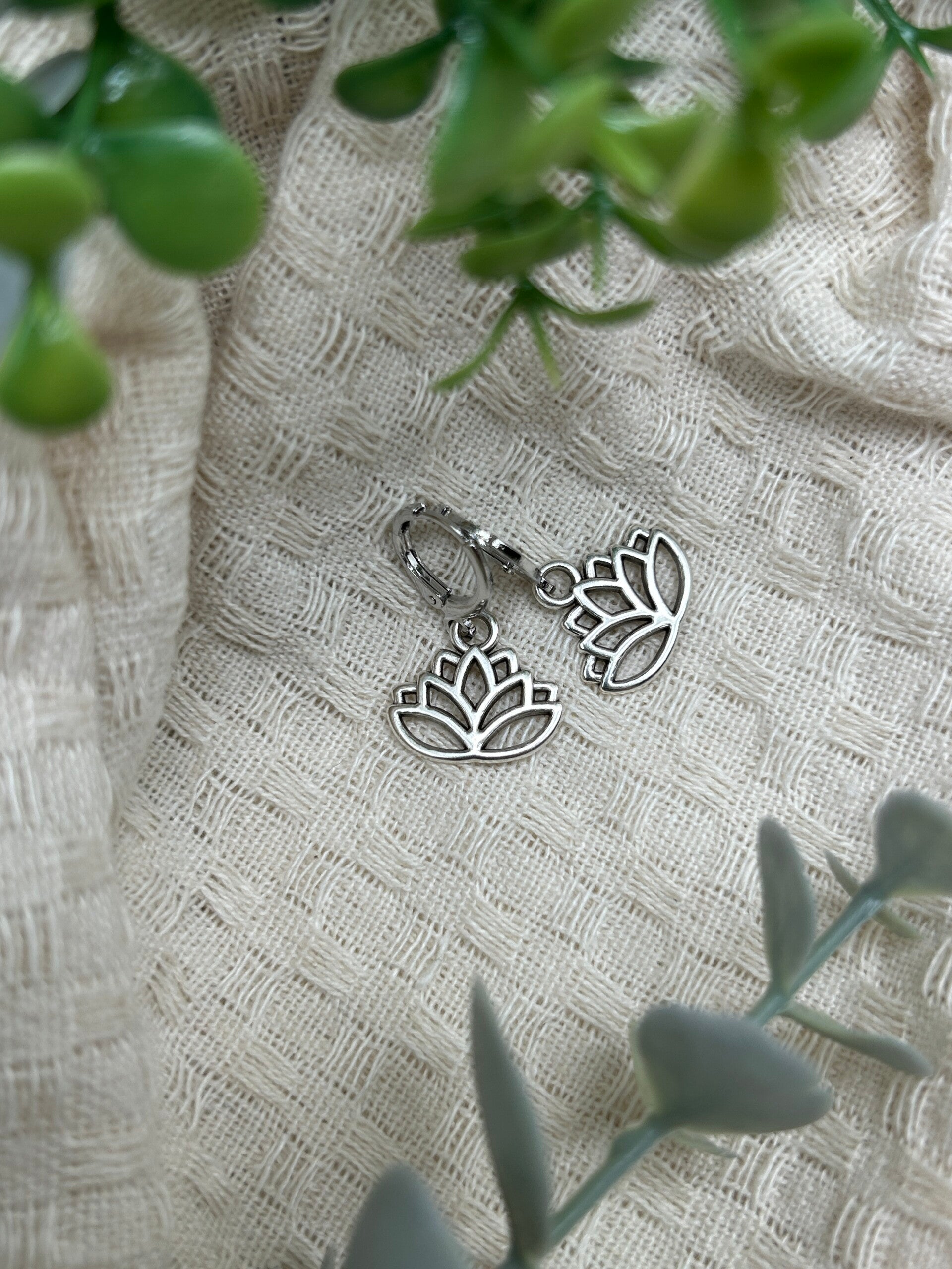 Een zilverkleurig oorbelletje in DQ-metaal met een zilveren lotus als hangertje. Ook geschikt voor kinderoortjes.