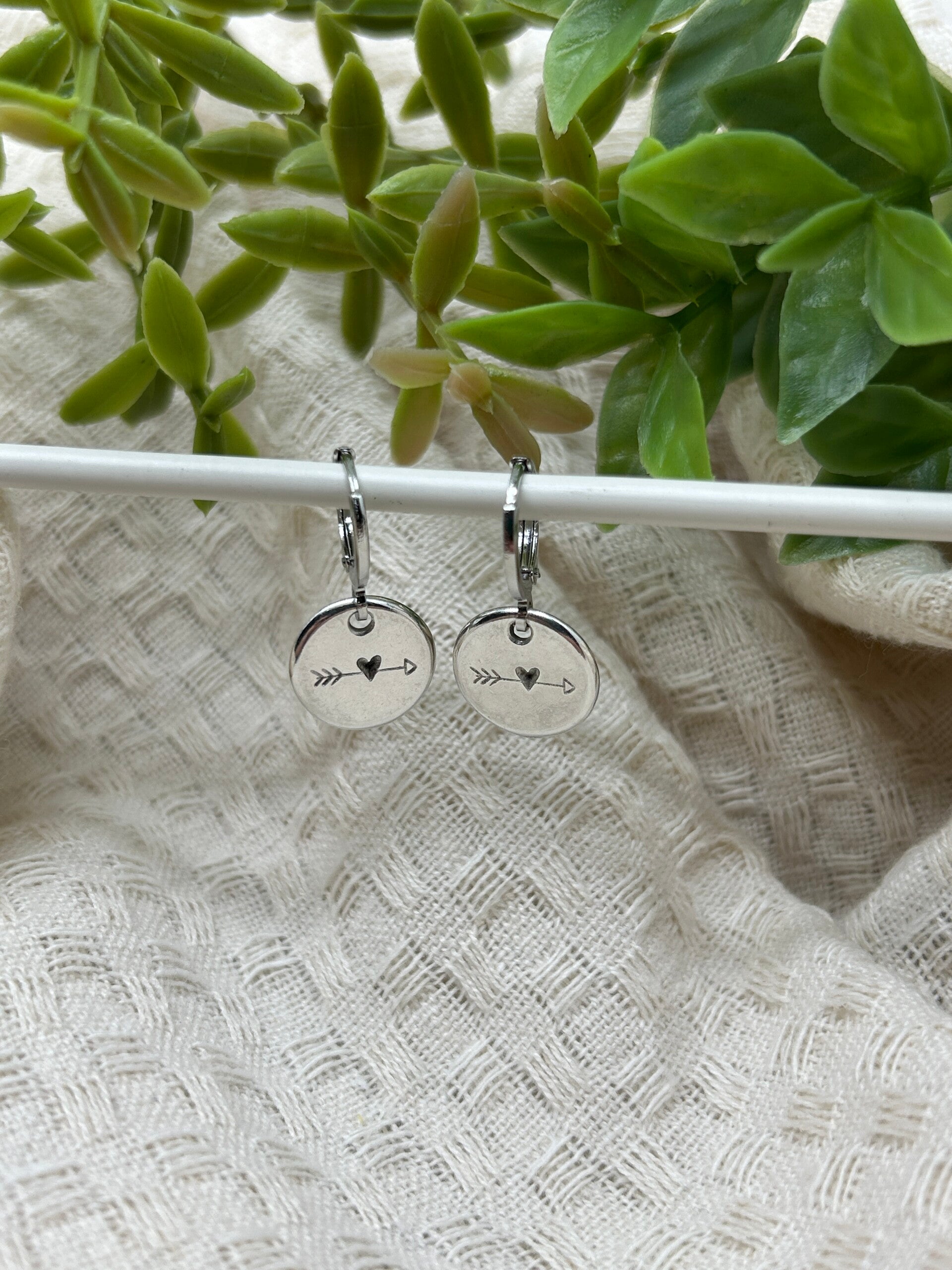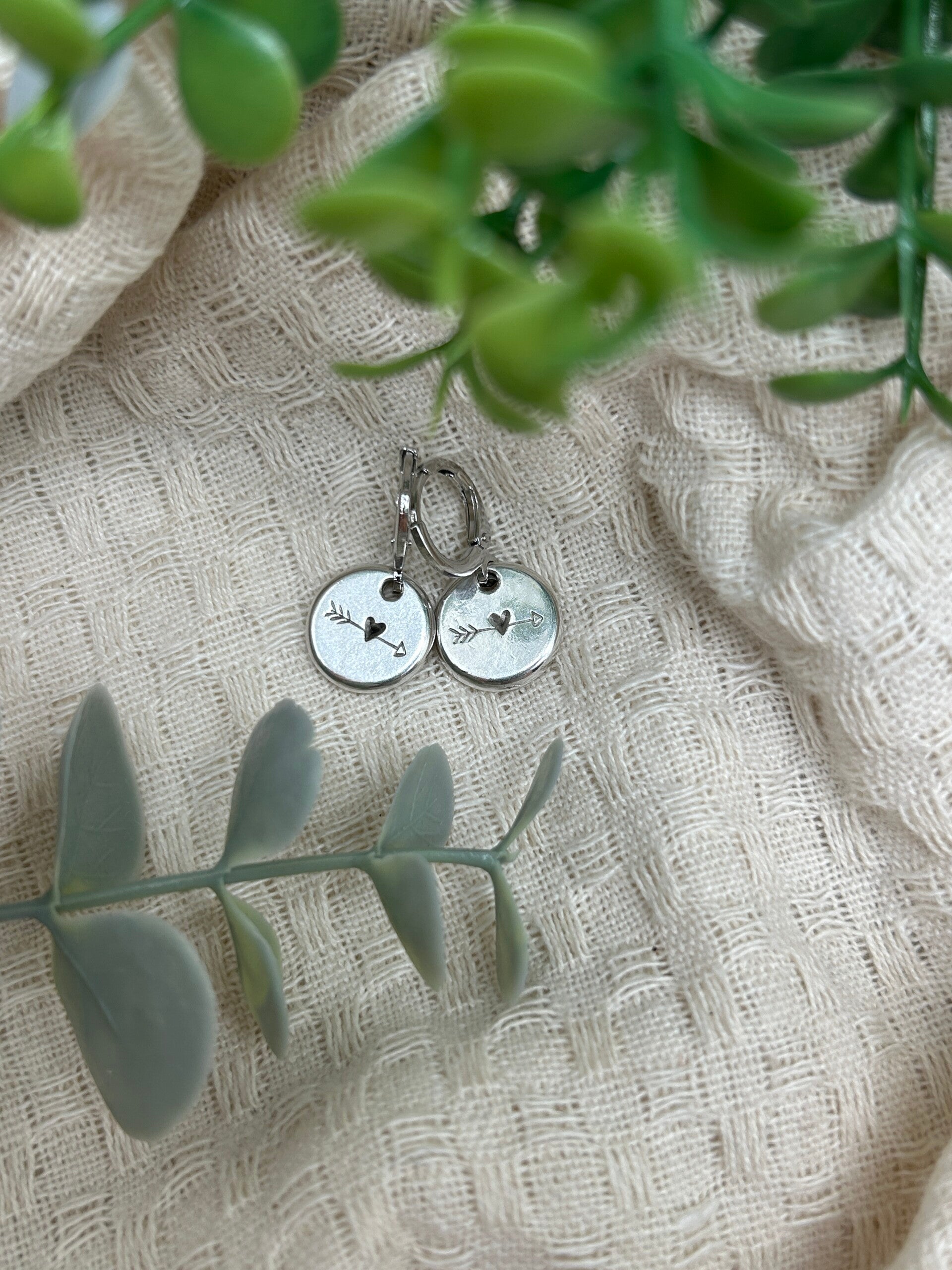 Een zilverkleurig oorbelletje in DQ-metaal met een zilveren plaatje als hangertje. Ook geschikt voor kinderoortjes.