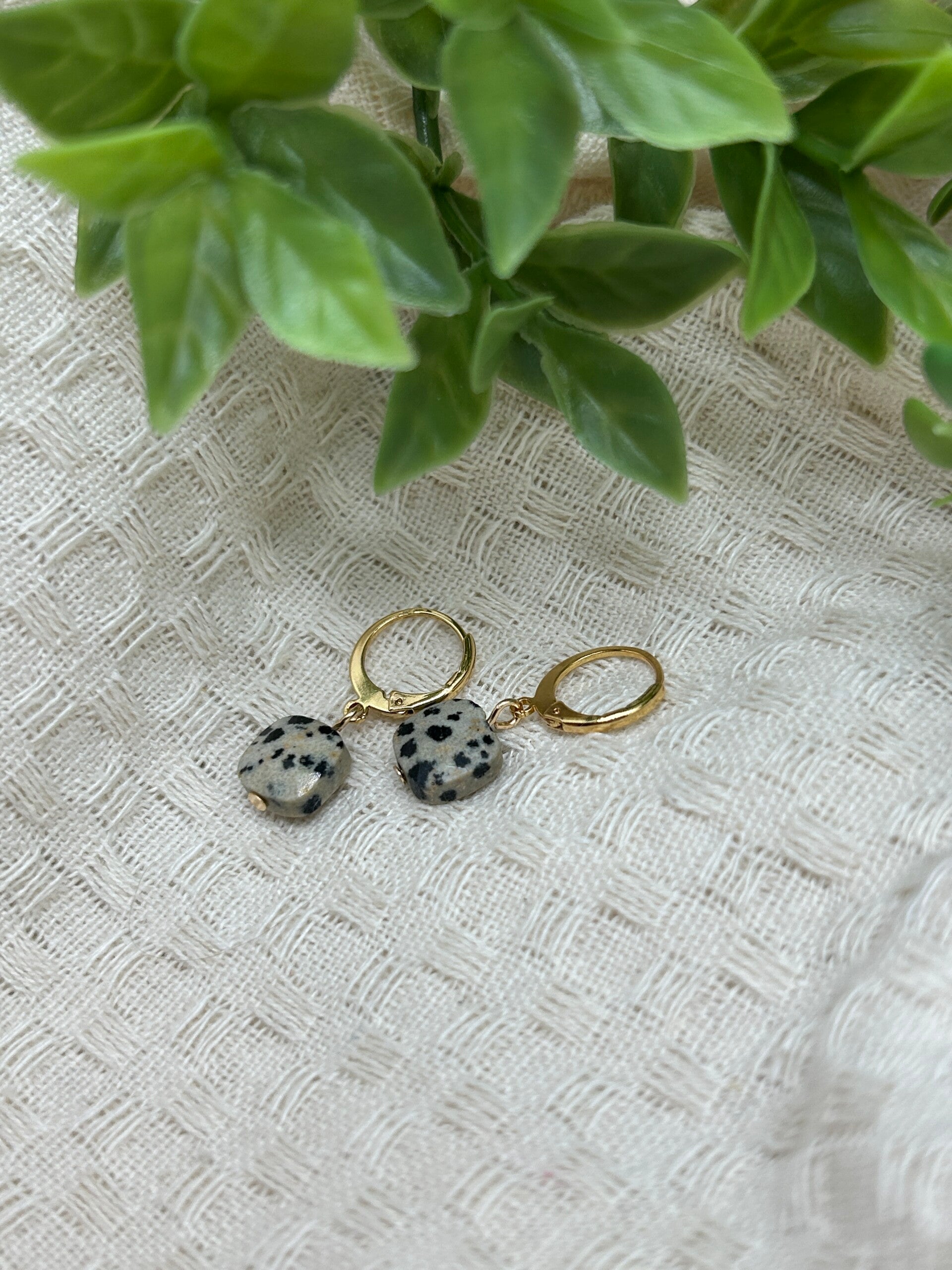 Deze gouden oorbellen zijn gemaakt van kwaliteitsvol DQ-metaal, met een hanger van dalmatian stollingsgesteente. Er wordt gezegd dat dit gesteente een beschermende en aardende werking heeft.
