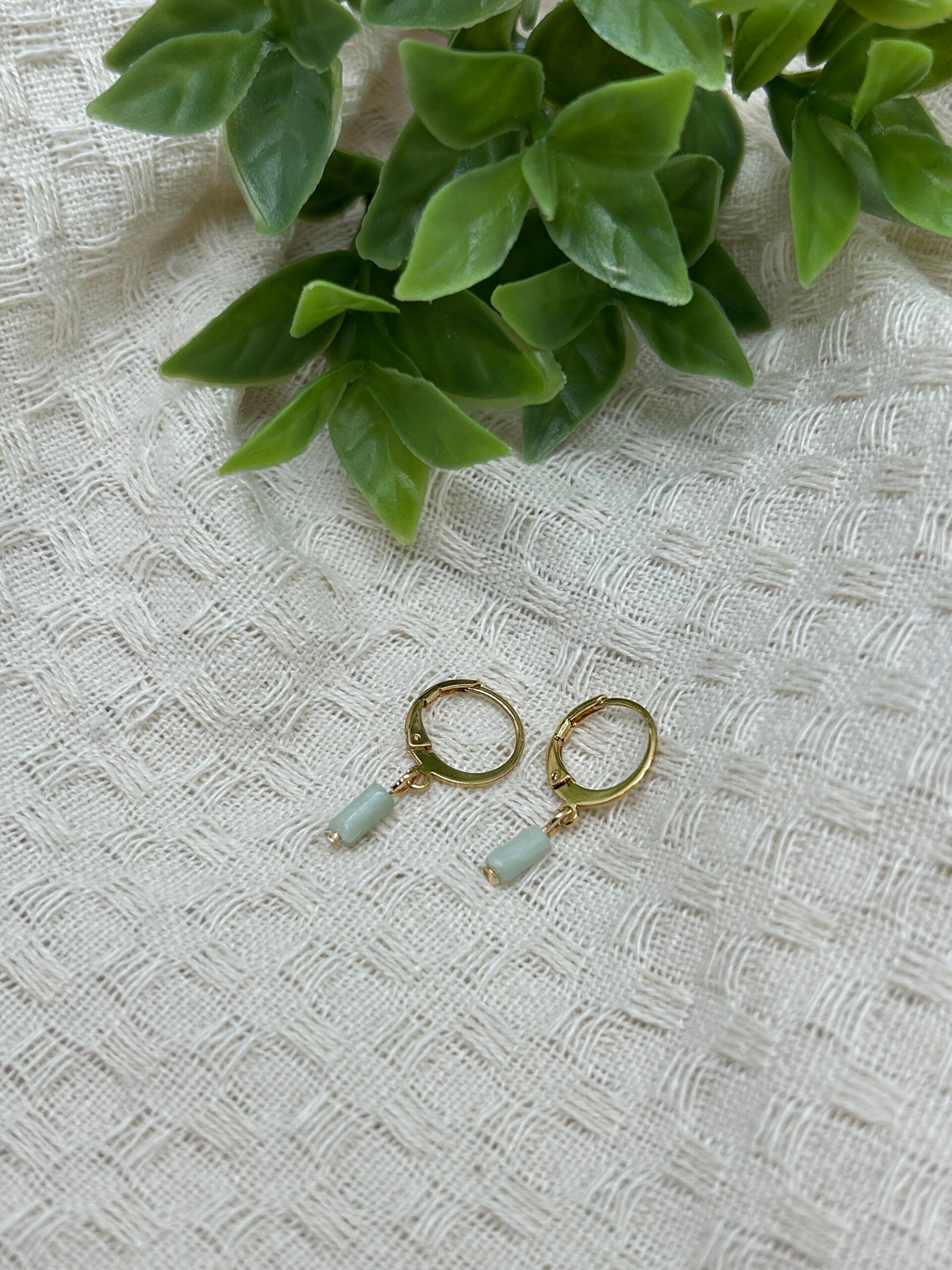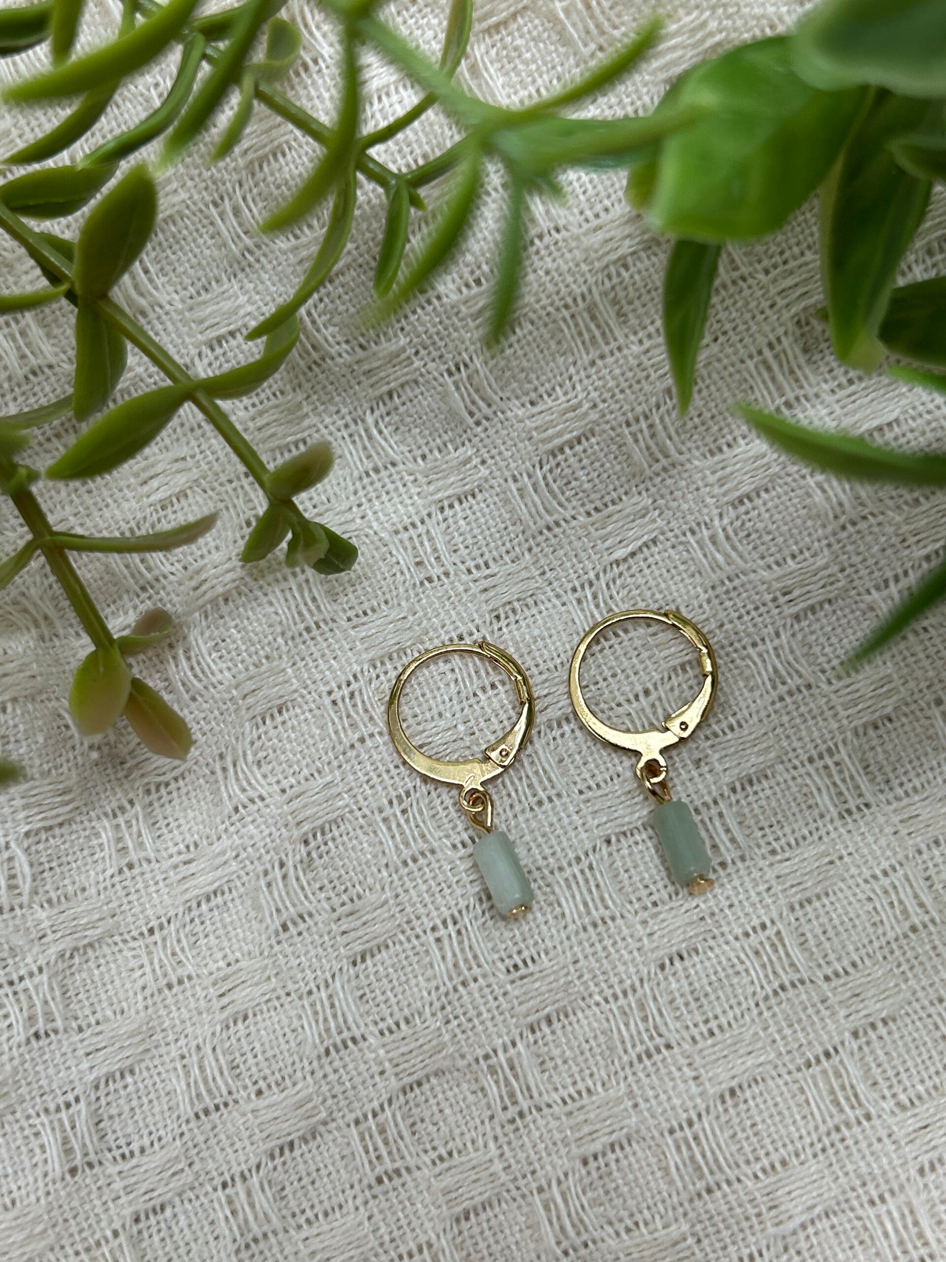 Deze gouden oorbellen zijn gemaakt van kwaliteitsvol DQ-metaal, met een hanger van dalmatian stollingsgesteente. Er wordt gezegd dat dit gesteente een beschermende en aardende werking heeft.